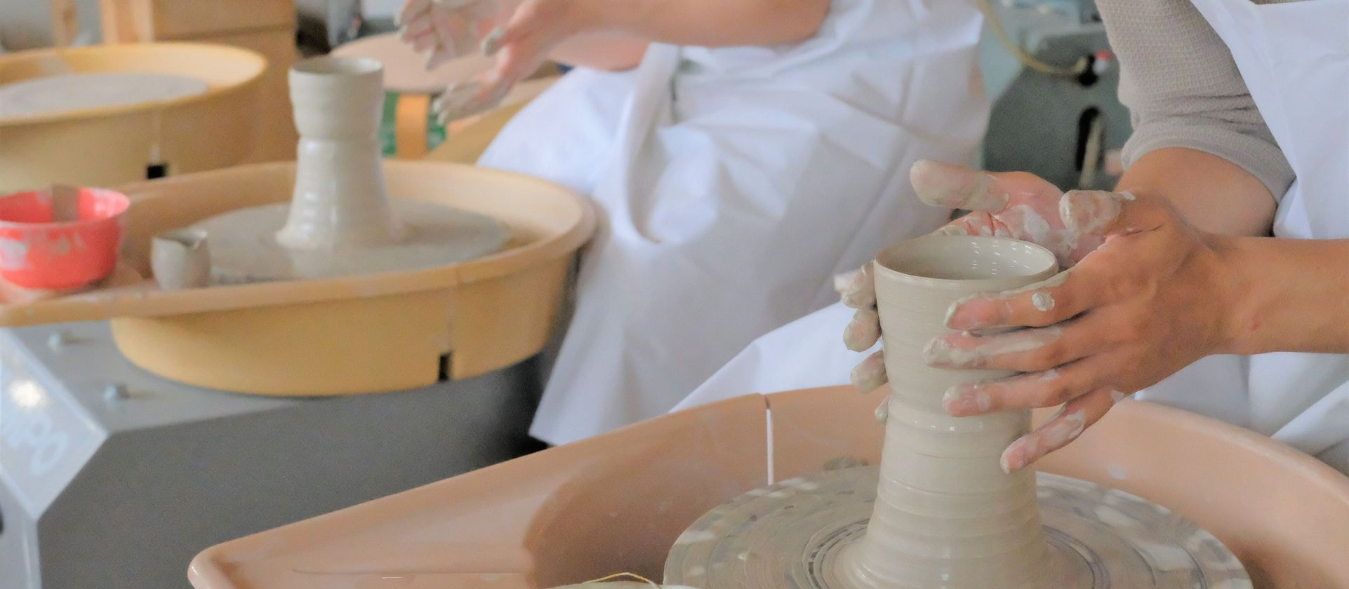 有田焼・伊万里焼などで知られる真っ白に焼きあがる磁器土を使って、ロクロ成形による器づくりの体験です。柔らかい粘土をコントロールするのはとても難しい事で、失敗する事もあります。ですが自身の掌で作り上げた器はきっと特別な食器になるはずです。
